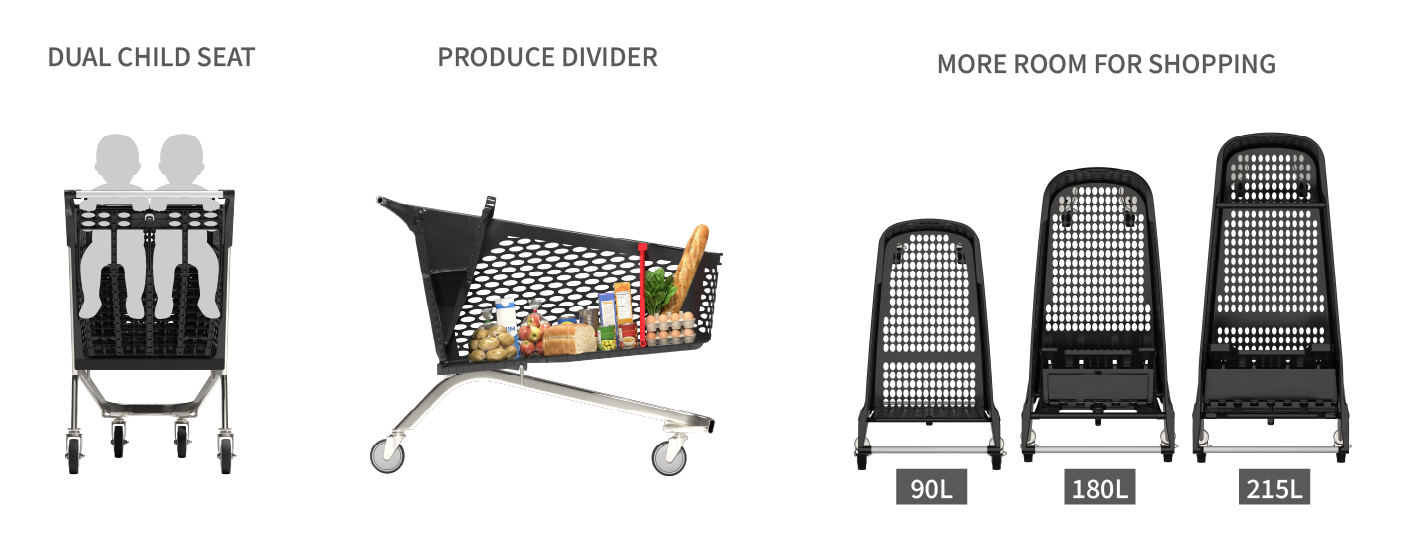 Our trolleys just got bigger and better with the addition of our new 215L shopping trolley. It’s designed and manufactured in Australia with the same great styling, rugged design and nimble handling as its smaller siblings, while adding a larger basket and a dual child seat as standard